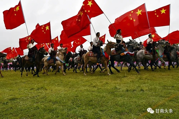 上午10時(shí)許,隨著高云龍宣布第二十屆九色甘南香巴拉旅游藝術(shù)節(jié)開(kāi)幕,由千匹駿馬、千名騎手組成的馬隊(duì)如騰飛的巨龍一般從主席臺(tái)前飛馳而過(guò),象征著偉大祖國(guó)從站起來(lái)、富起來(lái)到強(qiáng)起來(lái)光輝歷程的71面五星紅旗在會(huì)場(chǎng)迎風(fēng)飄揚(yáng)……